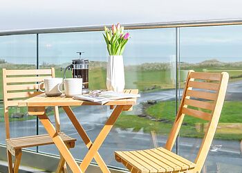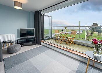 - Glass-fronted balcony with coastal views